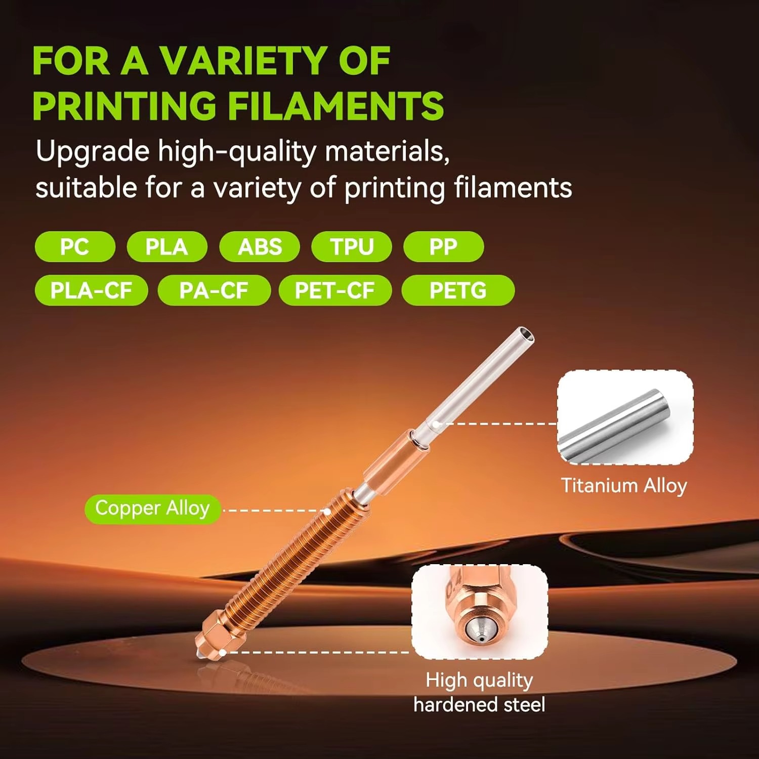 طراحی مهندسی دقیق و اتصال کاملاً فیت قطعات، از نشتی فیلامنت جلوگیری کرده و باعث تغذیه یکنواخت مواد و پایداری عملکرد در چاپهای طولانی میشود. استفاده از ساختار بایمتال شامل آلیاژ مس و فولاد سختکاریشده، انتقال حرارت عالی و مقاومت بالا در برابر سایش را تضمین میکند.