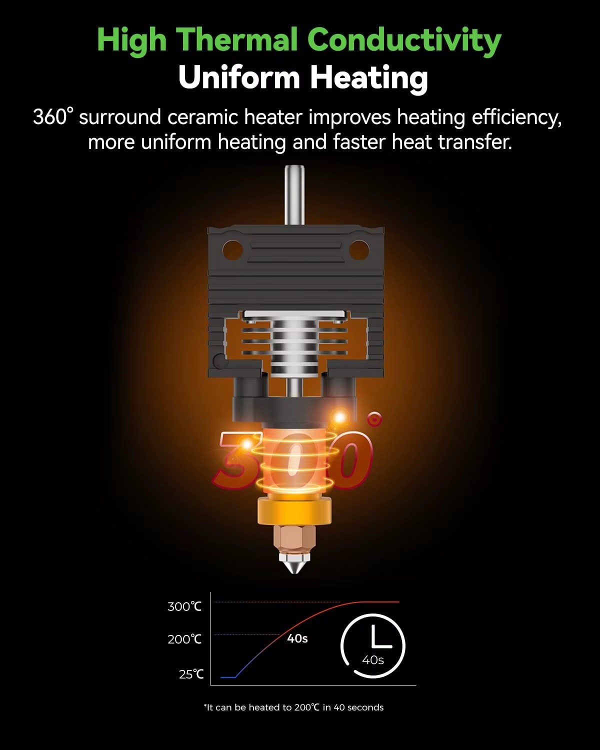 این مجموعه مجهز به المنت سرامیکی 60 وات بوده و قادر است دما را در کمتر از 40 ثانیه به 200 درجه سانتیگراد برساند. گرمایش سریع و یکنواخت باعث کاهش زمان آمادهسازی دستگاه و افزایش راندمان چاپ میشود، بهویژه در پروژههای سرعت بالا.